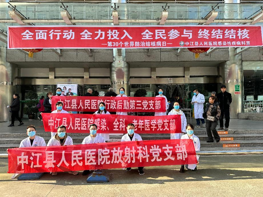 3月24日,我院行政后勤第三党支部联合感染、全科、老年医学党支部及放射科党支部,共同开展了以“全面行动、全力投入、全民参与、终结结核”为主题的“世界防治结核病日”宣传活动。